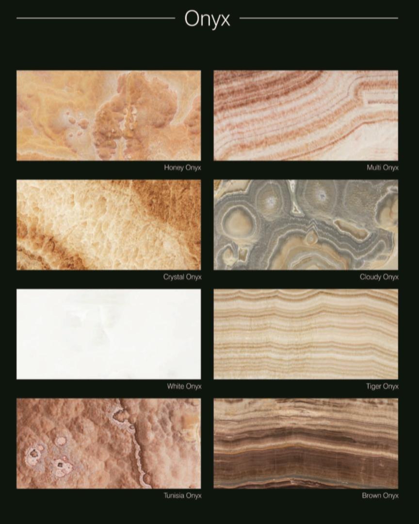 Onyx mermerde beyaz, kırmızı, bej, yeşil ve kahverengi renkler bulunur. Hem Dünya genelinde hem de Türkiye’de üretilen en pahalı mermer türlerindendir.